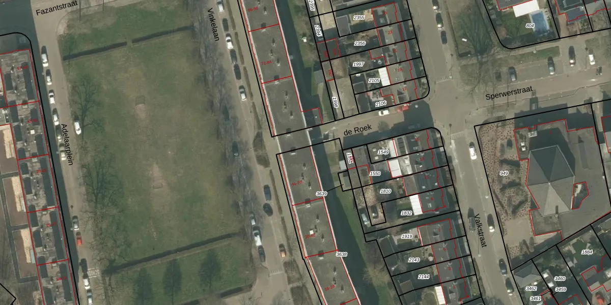Het perceel waarop Vinkelaan 56 staat heeft een oppervlakte van 1604 m². Dit is een zeer groot perceel. De perceeloppervlakte wordt geregistreerd door het Kadaster. Gedetailleerde informatie over de maten van dit perceel kunt u vinden in het rapport Kadastrale kaart met maatvoering van Vinkelaan 56.
