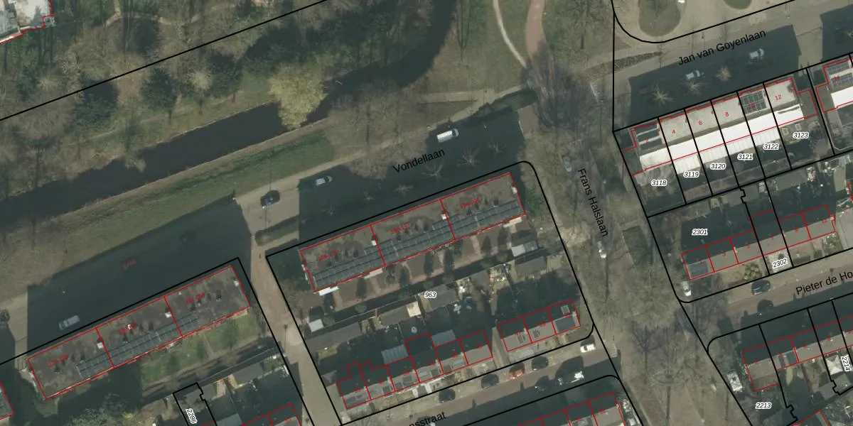 Het perceel waarop Vondellaan 186 staat heeft een oppervlakte van 2847 m². Dit is een zeer groot perceel. De perceeloppervlakte wordt geregistreerd door het Kadaster. Gedetailleerde informatie over de maten van dit perceel kunt u vinden in het rapport Kadastrale kaart met maatvoering van Vondellaan 186.