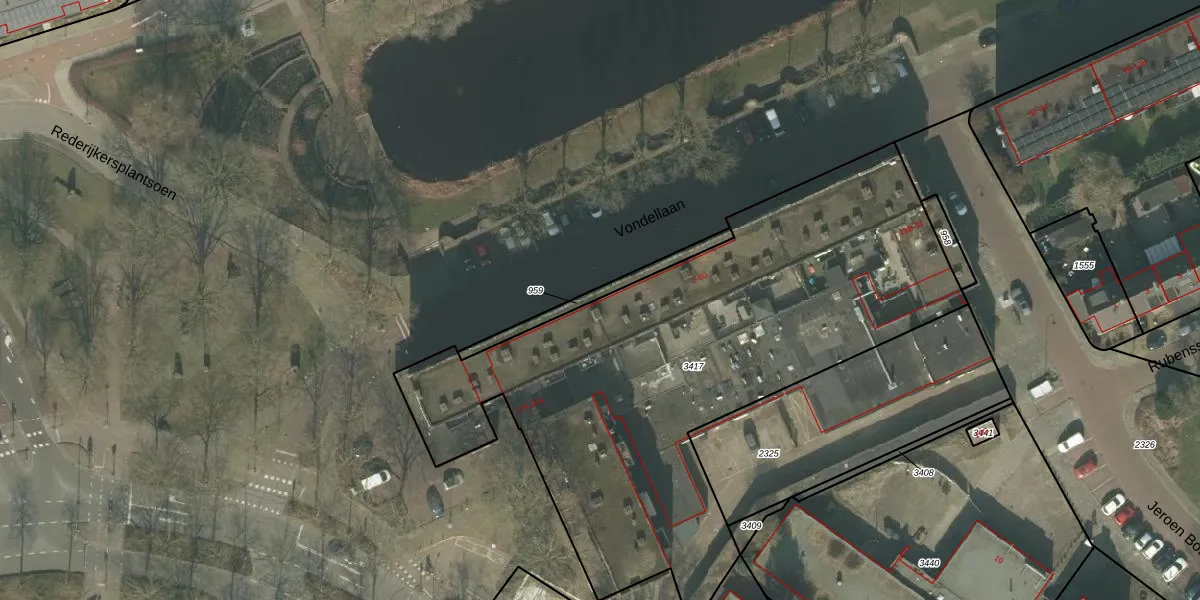 Het perceel waarop Vondellaan 30 staat heeft een oppervlakte van 2912 m². Dit is een zeer groot perceel. De perceeloppervlakte wordt geregistreerd door het Kadaster. Gedetailleerde informatie over de maten van dit perceel kunt u vinden in het rapport Kadastrale kaart met maatvoering van Vondellaan 30.