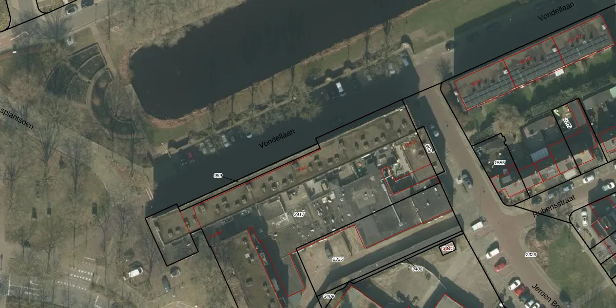 Het perceel waarop Vondellaan 48 staat heeft een oppervlakte van 81 m². Dit is een klein perceel. De perceeloppervlakte wordt geregistreerd door het Kadaster. Gedetailleerde informatie over de maten van dit perceel kunt u vinden in het rapport Kadastrale kaart met maatvoering van Vondellaan 48.