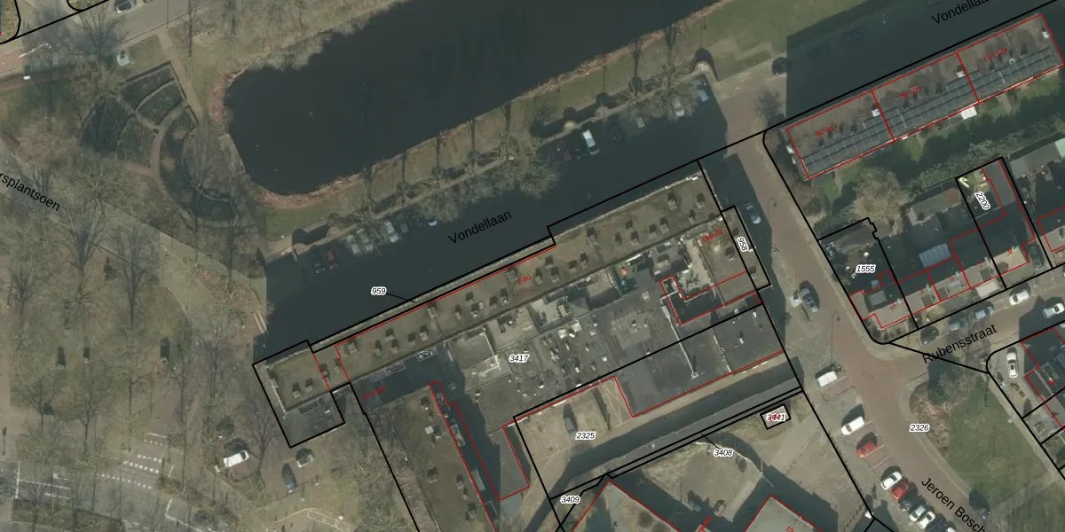 Het perceel waarop Vondellaan 50 staat heeft een oppervlakte van 2912 m². Dit is een zeer groot perceel. De perceeloppervlakte wordt geregistreerd door het Kadaster. Gedetailleerde informatie over de maten van dit perceel kunt u vinden in het rapport Kadastrale kaart met maatvoering van Vondellaan 50.