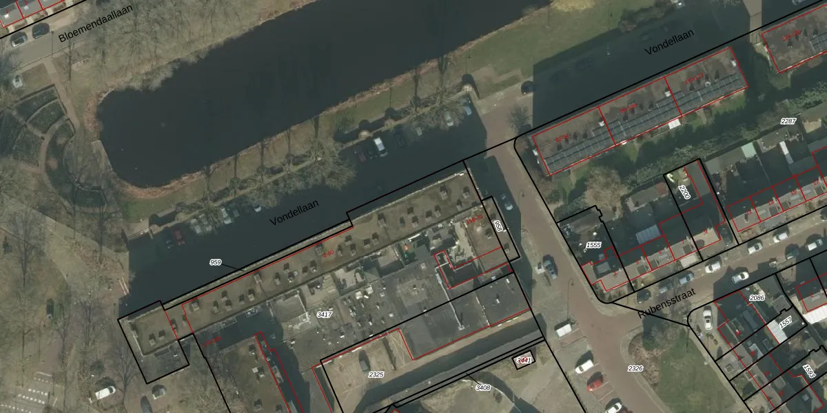 Het perceel waarop Vondellaan 72 staat heeft een oppervlakte van 2912 m². Dit is een zeer groot perceel. De perceeloppervlakte wordt geregistreerd door het Kadaster. Gedetailleerde informatie over de maten van dit perceel kunt u vinden in het rapport Kadastrale kaart met maatvoering van Vondellaan 72.