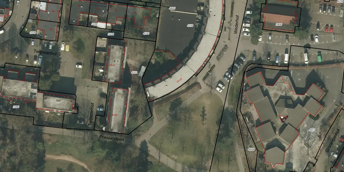 Het perceel waarop Wederhof 19 staat heeft een oppervlakte van 2391 m². Dit is een zeer groot perceel. De perceeloppervlakte wordt geregistreerd door het Kadaster. Gedetailleerde informatie over de maten van dit perceel kunt u vinden in het rapport Kadastrale kaart met maatvoering van Wederhof 19.