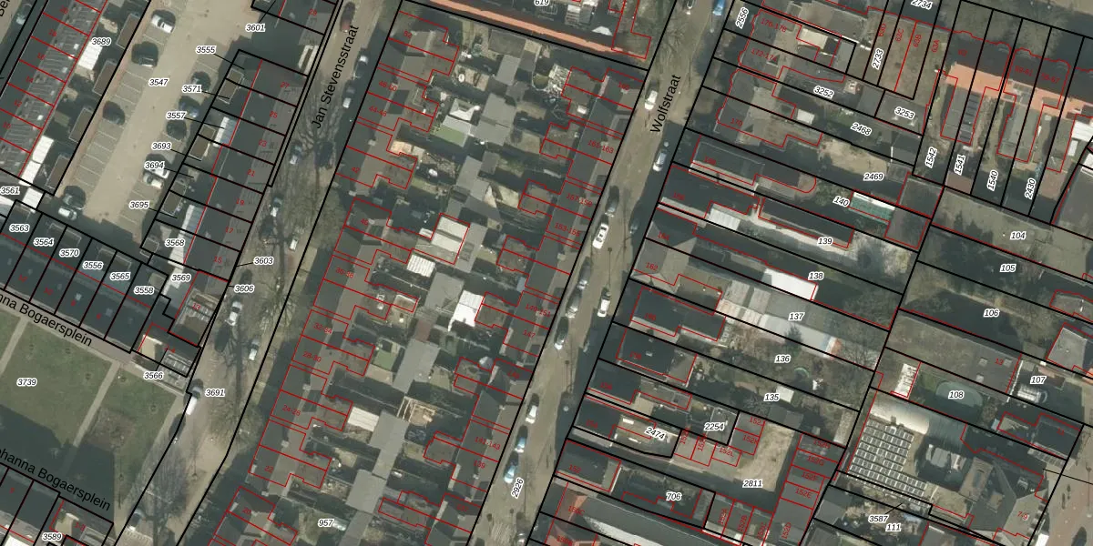 Het perceel waarop Wolfstraat 151 staat heeft een oppervlakte van 6790 m². Dit is een zeer groot perceel. De perceeloppervlakte wordt geregistreerd door het Kadaster. Gedetailleerde informatie over de maten van dit perceel kunt u vinden in het rapport Kadastrale kaart met maatvoering van Wolfstraat 151.