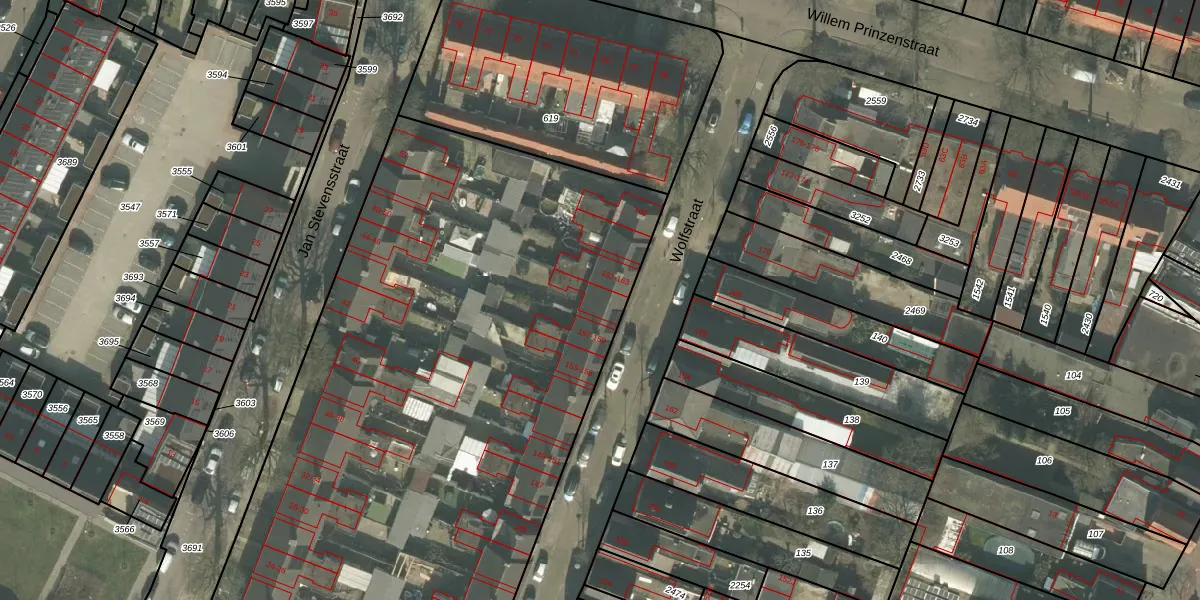 Het perceel waarop Wolfstraat 159 staat heeft een oppervlakte van 6790 m². Dit is een zeer groot perceel. De perceeloppervlakte wordt geregistreerd door het Kadaster. Gedetailleerde informatie over de maten van dit perceel kunt u vinden in het rapport Kadastrale kaart met maatvoering van Wolfstraat 159.