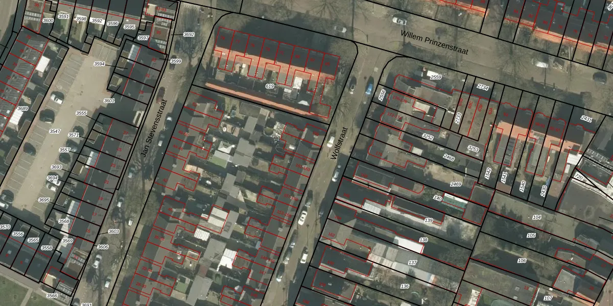 Het perceel waarop Wolfstraat 163 staat heeft een oppervlakte van 6790 m². Dit is een zeer groot perceel. De perceeloppervlakte wordt geregistreerd door het Kadaster. Gedetailleerde informatie over de maten van dit perceel kunt u vinden in het rapport Kadastrale kaart met maatvoering van Wolfstraat 163.