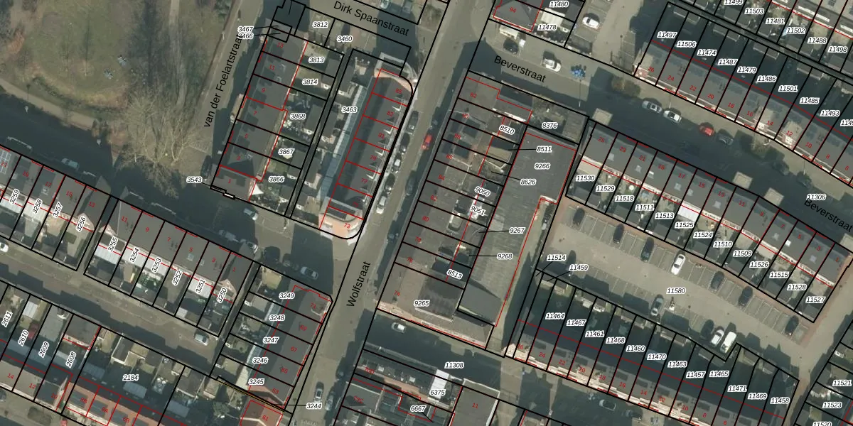 Het perceel waarop Wolfstraat 80 staat heeft een oppervlakte van 92 m². Dit is een klein perceel. De perceeloppervlakte wordt geregistreerd door het Kadaster. Gedetailleerde informatie over de maten van dit perceel kunt u vinden in het rapport Kadastrale kaart met maatvoering van Wolfstraat 80.