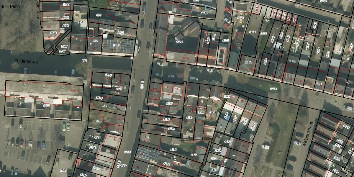 Het perceel waarop Zuiderstraat 53 staat heeft een oppervlakte van 381 m². Dit is een groot perceel. De perceeloppervlakte wordt geregistreerd door het Kadaster. Gedetailleerde informatie over de maten van dit perceel kunt u vinden in het rapport Kadastrale kaart met maatvoering van Zuiderstraat 53.