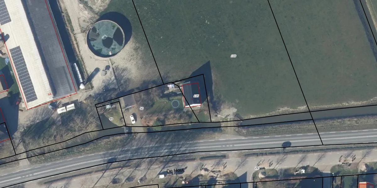 Het perceel waarop De Hout 2 staat heeft een oppervlakte van 265 m². Dit is een middelgroot perceel. De perceeloppervlakte wordt geregistreerd door het Kadaster. Gedetailleerde informatie over de maten van dit perceel kunt u vinden in het rapport Kadastrale kaart met maatvoering van De Hout 2.