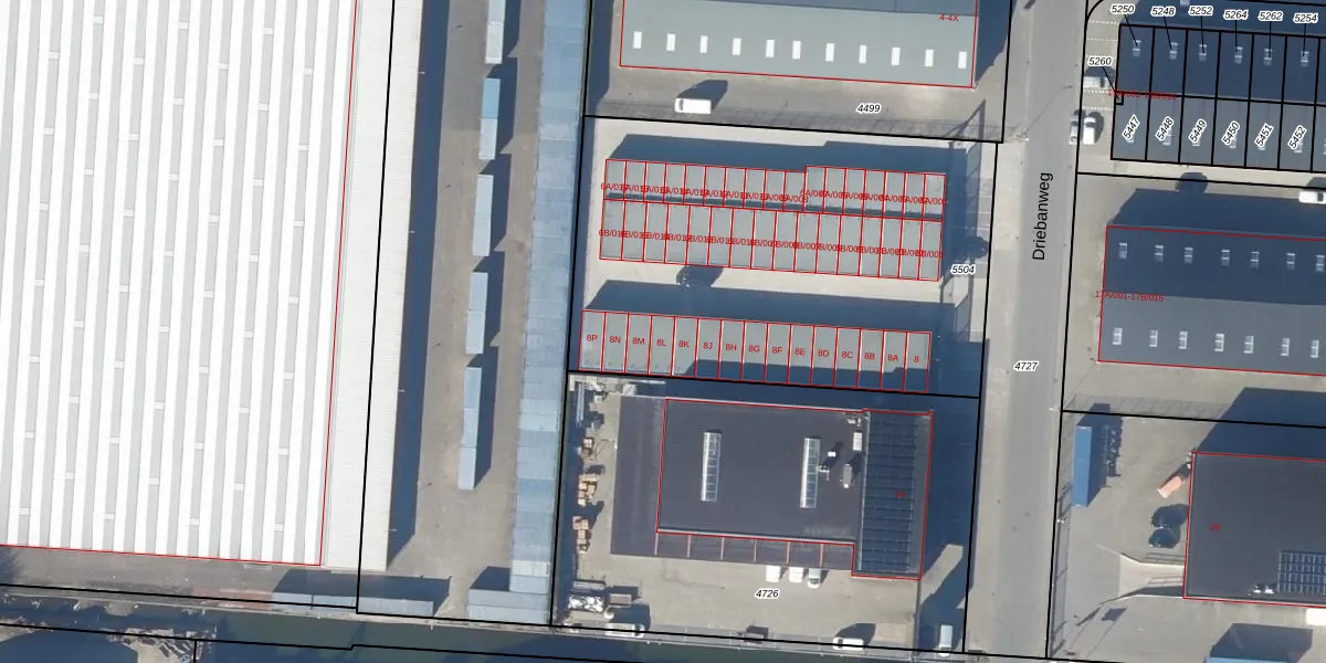 Het perceel waarop Driebanweg 8-L staat heeft een oppervlakte van 2410 m². Dit is een zeer groot perceel. De perceeloppervlakte wordt geregistreerd door het Kadaster. Gedetailleerde informatie over de maten van dit perceel kunt u vinden in het rapport Kadastrale kaart met maatvoering van Driebanweg 8-L.