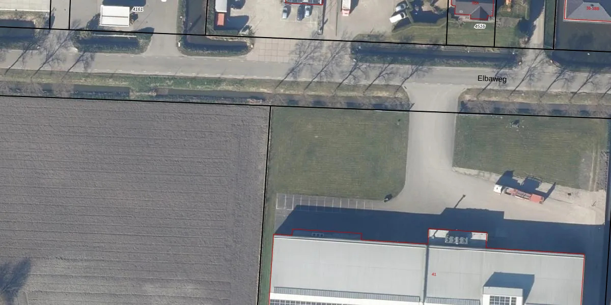 Het perceel waarop Elbaweg 41-E staat heeft een oppervlakte van 4,0 ha. Dit is een zeer groot perceel. De perceeloppervlakte wordt geregistreerd door het Kadaster. Gedetailleerde informatie over de maten van dit perceel kunt u vinden in het rapport Kadastrale kaart met maatvoering van Elbaweg 41-E.