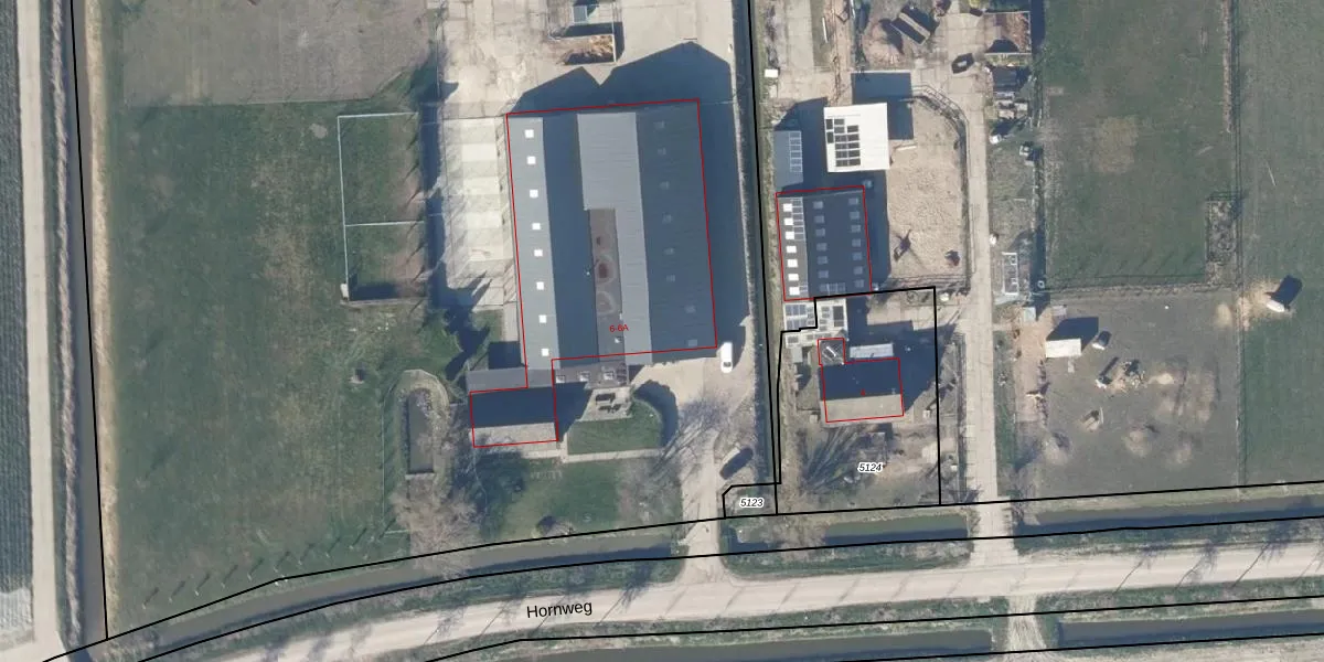 Het perceel waarop Hornweg 6-A staat heeft een oppervlakte van 1,6 ha. Dit is een zeer groot perceel. De perceeloppervlakte wordt geregistreerd door het Kadaster. Gedetailleerde informatie over de maten van dit perceel kunt u vinden in het rapport Kadastrale kaart met maatvoering van Hornweg 6-A.