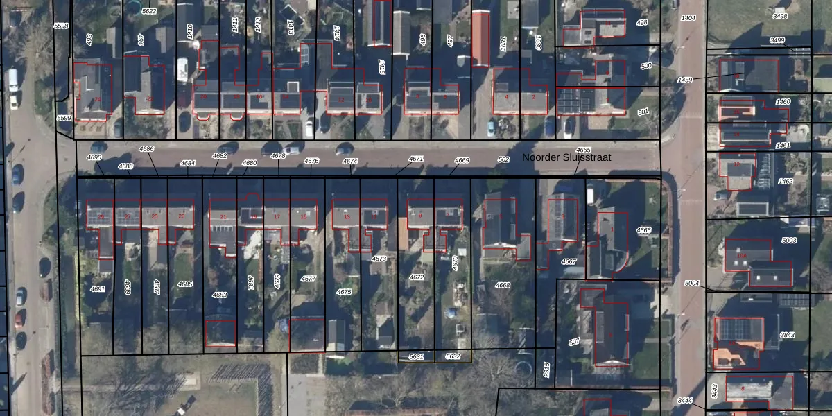 Het perceel waarop Noorder Sluisstraat 9 staat heeft een oppervlakte van 365 m². Dit is een groot perceel. De perceeloppervlakte wordt geregistreerd door het Kadaster. Gedetailleerde informatie over de maten van dit perceel kunt u vinden in het rapport Kadastrale kaart met maatvoering van Noorder Sluisstraat 9.