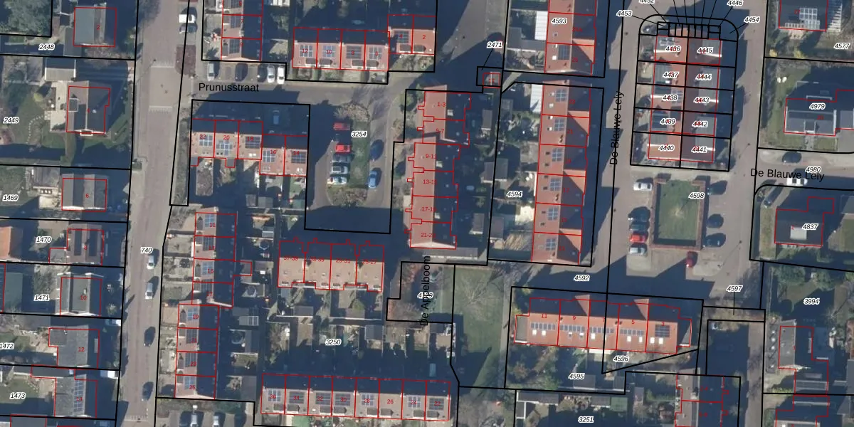 Het perceel waarop Prunusstraat 17 staat heeft een oppervlakte van 4560 m². Dit is een zeer groot perceel. De perceeloppervlakte wordt geregistreerd door het Kadaster. Gedetailleerde informatie over de maten van dit perceel kunt u vinden in het rapport Kadastrale kaart met maatvoering van Prunusstraat 17.