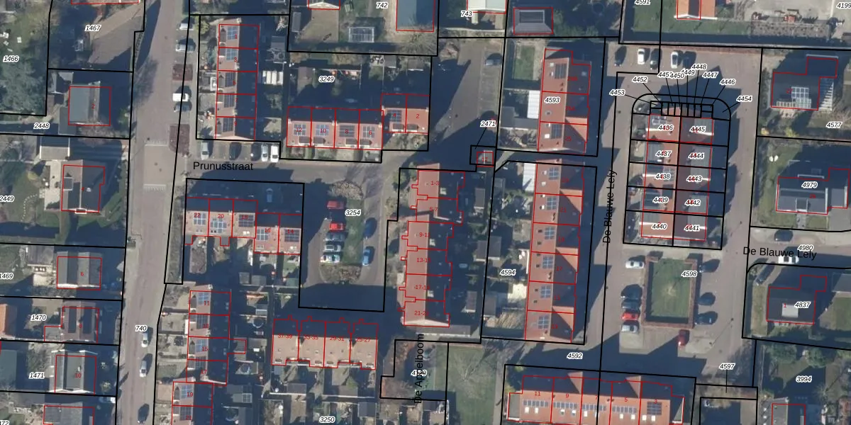 Het perceel waarop Prunusstraat 5 staat heeft een oppervlakte van 4560 m². Dit is een zeer groot perceel. De perceeloppervlakte wordt geregistreerd door het Kadaster. Gedetailleerde informatie over de maten van dit perceel kunt u vinden in het rapport Kadastrale kaart met maatvoering van Prunusstraat 5.