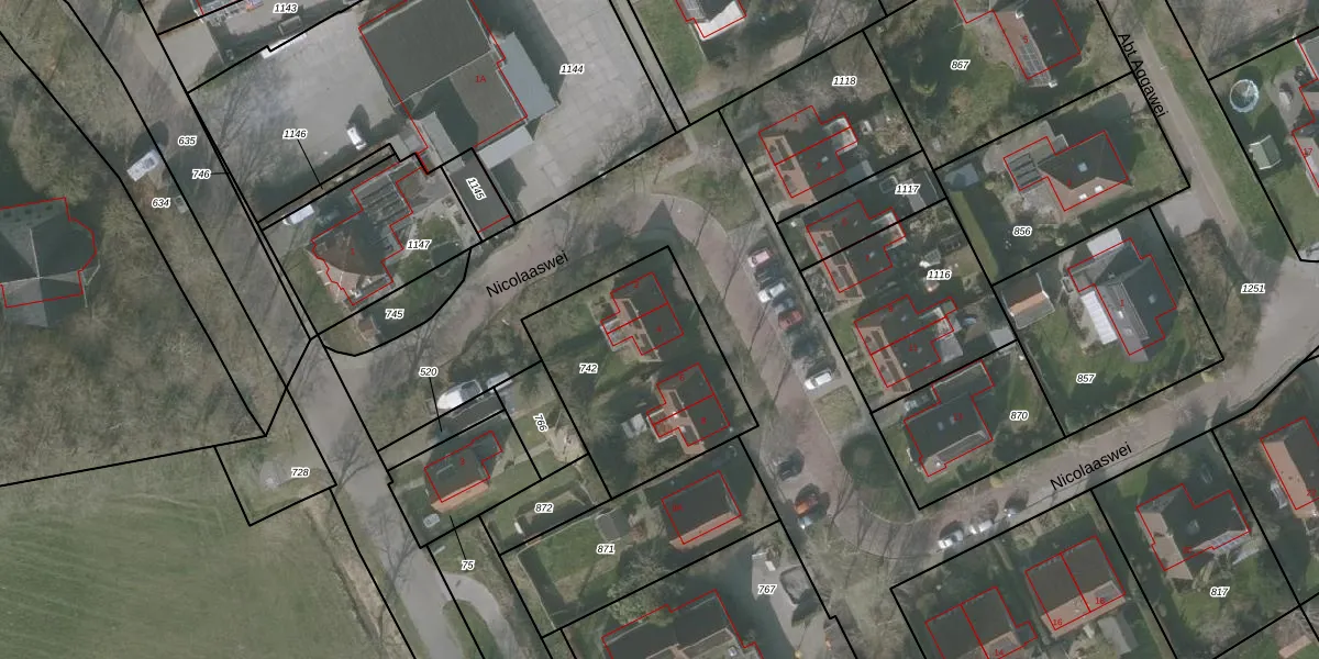 Het perceel waarop Nicolaaswei 4 staat heeft een oppervlakte van 758 m². Dit is een groot perceel. De perceeloppervlakte wordt geregistreerd door het Kadaster. Gedetailleerde informatie over de maten van dit perceel kunt u vinden in het rapport Kadastrale kaart met maatvoering van Nicolaaswei 4.
