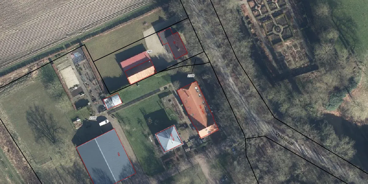 Het perceel waarop Veldstraat 79-m staat heeft een oppervlakte van 1,1 ha. Dit is een zeer groot perceel. De perceeloppervlakte wordt geregistreerd door het Kadaster. Gedetailleerde informatie over de maten van dit perceel kunt u vinden in het rapport Kadastrale kaart met maatvoering van Veldstraat 79-m.