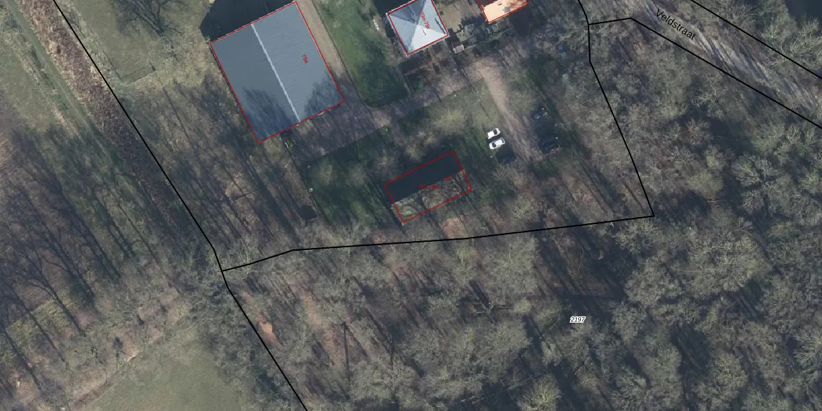 Het perceel waarop Veldstraat 79-t staat heeft een oppervlakte van 1,1 ha. Dit is een zeer groot perceel. De perceeloppervlakte wordt geregistreerd door het Kadaster. Gedetailleerde informatie over de maten van dit perceel kunt u vinden in het rapport Kadastrale kaart met maatvoering van Veldstraat 79-t.