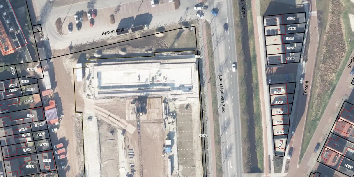 Het perceel waarop Appendage 55 staat heeft een oppervlakte van 9359 m². Dit is een zeer groot perceel. De perceeloppervlakte wordt geregistreerd door het Kadaster. Gedetailleerde informatie over de maten van dit perceel kunt u vinden in het rapport Kadastrale kaart met maatvoering van Appendage 55.