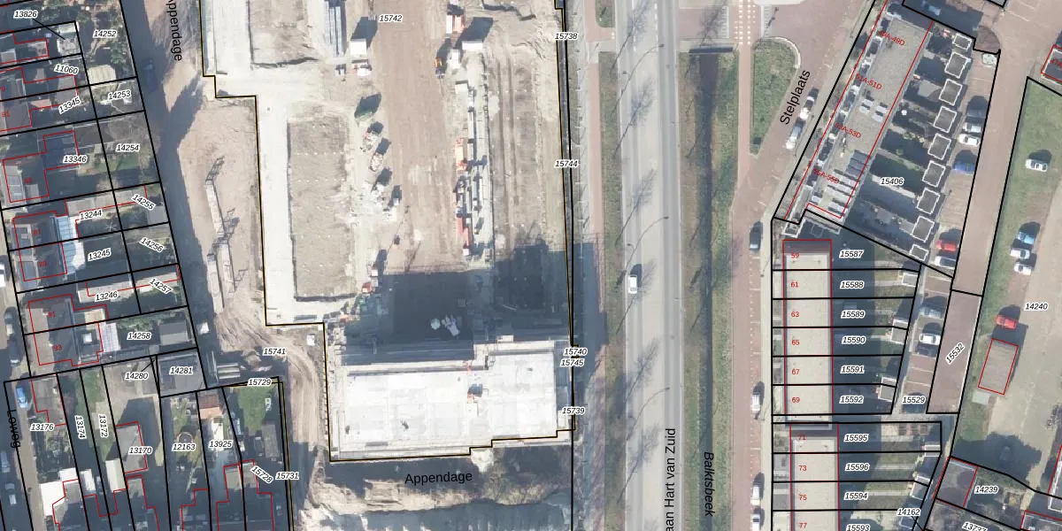 Het perceel waarop Appendage 89 staat heeft een oppervlakte van 9359 m². Dit is een zeer groot perceel. De perceeloppervlakte wordt geregistreerd door het Kadaster. Gedetailleerde informatie over de maten van dit perceel kunt u vinden in het rapport Kadastrale kaart met maatvoering van Appendage 89.