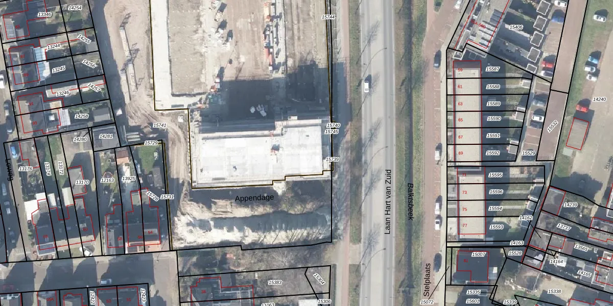 Het perceel waarop Appendage 95 staat heeft een oppervlakte van 9359 m². Dit is een zeer groot perceel. De perceeloppervlakte wordt geregistreerd door het Kadaster. Gedetailleerde informatie over de maten van dit perceel kunt u vinden in het rapport Kadastrale kaart met maatvoering van Appendage 95.