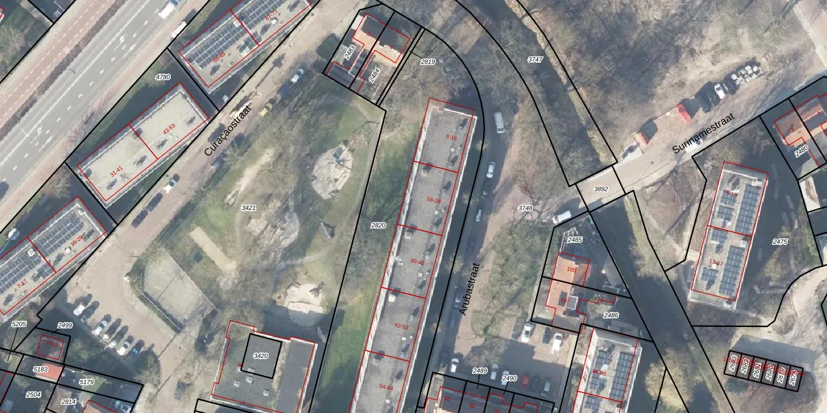 Het perceel waarop Arubastraat 28 staat heeft een oppervlakte van 2338 m². Dit is een zeer groot perceel. De perceeloppervlakte wordt geregistreerd door het Kadaster. Gedetailleerde informatie over de maten van dit perceel kunt u vinden in het rapport Kadastrale kaart met maatvoering van Arubastraat 28.