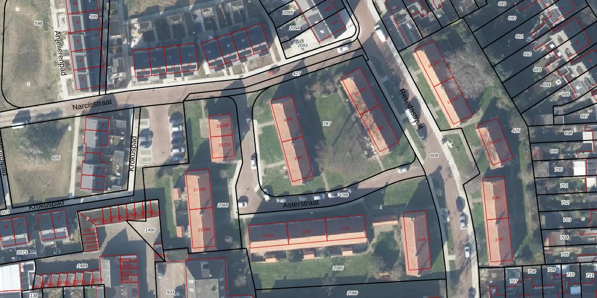 Het perceel waarop Asterstraat 4-I staat heeft een oppervlakte van 1820 m². Dit is een zeer groot perceel. De perceeloppervlakte wordt geregistreerd door het Kadaster. Gedetailleerde informatie over de maten van dit perceel kunt u vinden in het rapport Kadastrale kaart met maatvoering van Asterstraat 4-I.