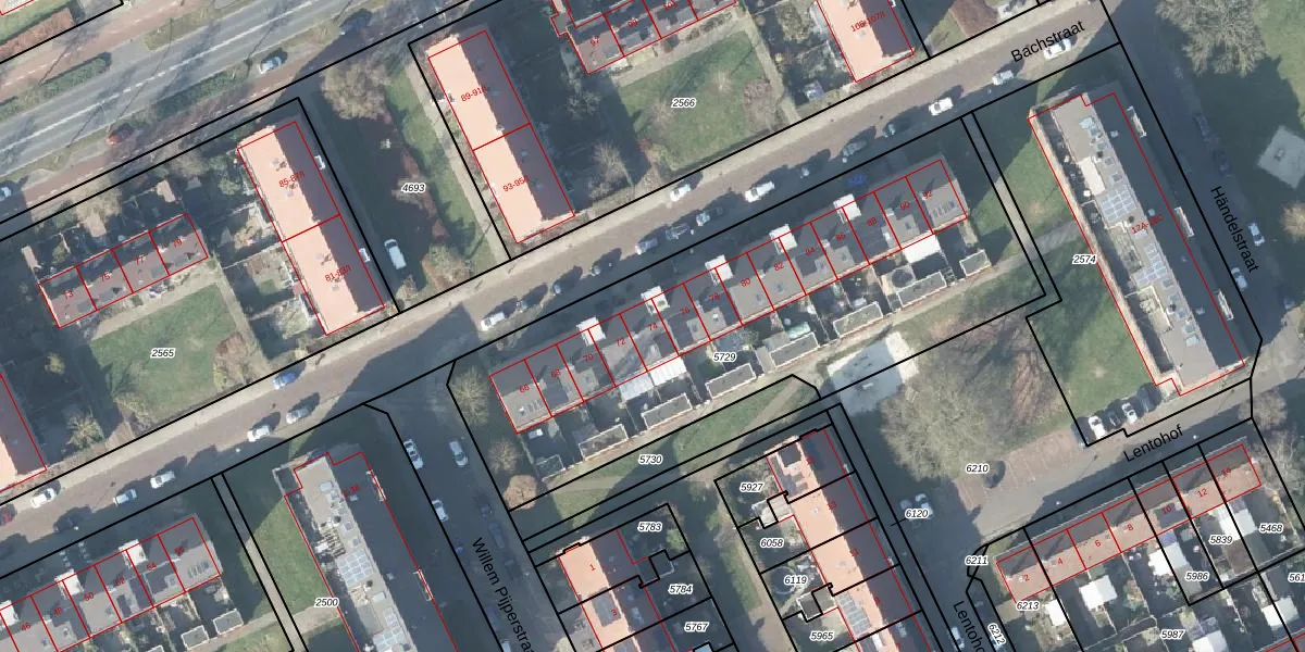 Het perceel waarop Bachstraat 74 staat heeft een oppervlakte van 2380 m². Dit is een zeer groot perceel. De perceeloppervlakte wordt geregistreerd door het Kadaster. Gedetailleerde informatie over de maten van dit perceel kunt u vinden in het rapport Kadastrale kaart met maatvoering van Bachstraat 74.