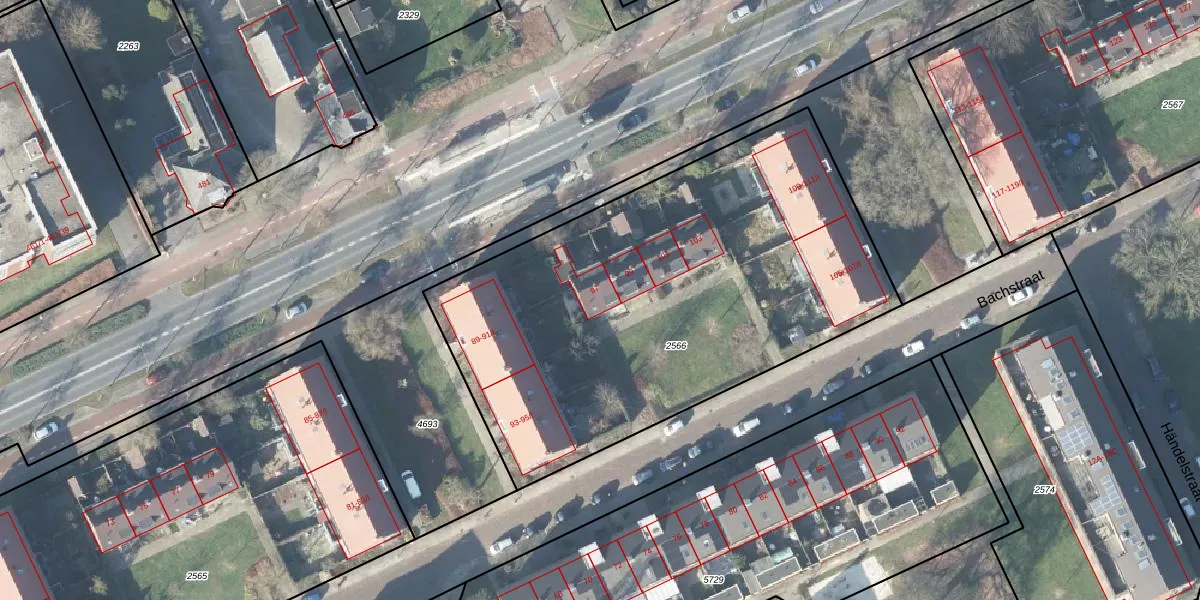 Het perceel waarop Bachstraat 97 staat heeft een oppervlakte van 2605 m². Dit is een zeer groot perceel. De perceeloppervlakte wordt geregistreerd door het Kadaster. Gedetailleerde informatie over de maten van dit perceel kunt u vinden in het rapport Kadastrale kaart met maatvoering van Bachstraat 97.