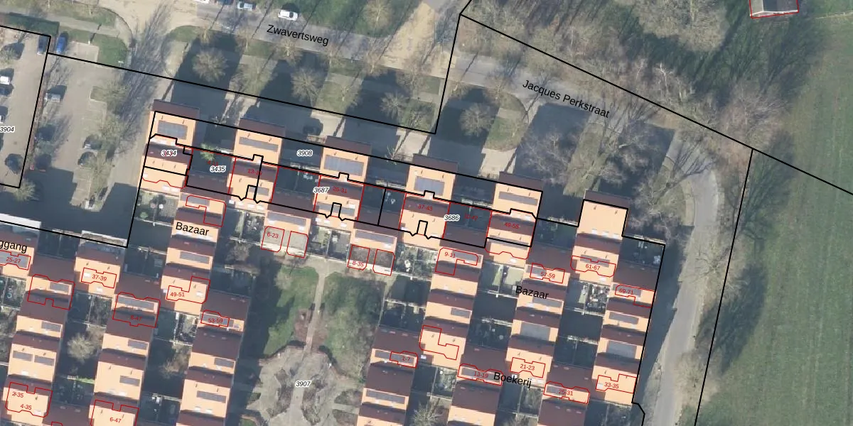 Het perceel waarop Bazaar 12 staat heeft een oppervlakte van 308 m². Dit is een groot perceel. De perceeloppervlakte wordt geregistreerd door het Kadaster. Gedetailleerde informatie over de maten van dit perceel kunt u vinden in het rapport Kadastrale kaart met maatvoering van Bazaar 12.