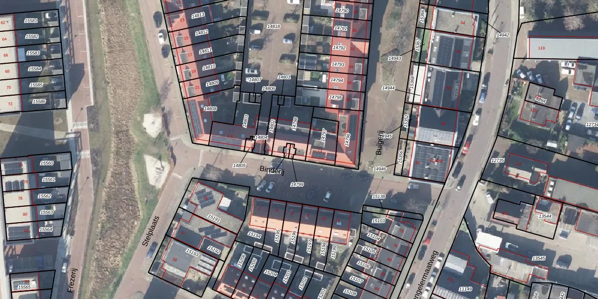 Het perceel waarop Binderij 11 staat heeft een oppervlakte van 199 m². Dit is een middelgroot perceel. De perceeloppervlakte wordt geregistreerd door het Kadaster. Gedetailleerde informatie over de maten van dit perceel kunt u vinden in het rapport Kadastrale kaart met maatvoering van Binderij 11.