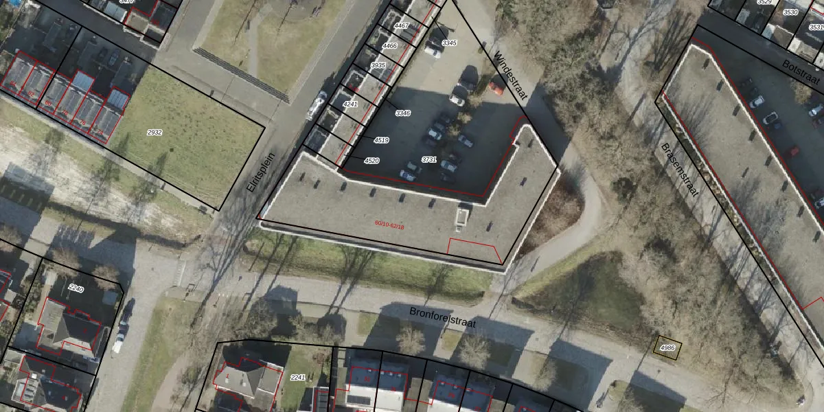 Het perceel waarop Bronforelstraat 62-10 staat heeft een oppervlakte van 2320 m². Dit is een zeer groot perceel. De perceeloppervlakte wordt geregistreerd door het Kadaster. Gedetailleerde informatie over de maten van dit perceel kunt u vinden in het rapport Kadastrale kaart met maatvoering van Bronforelstraat 62-10.