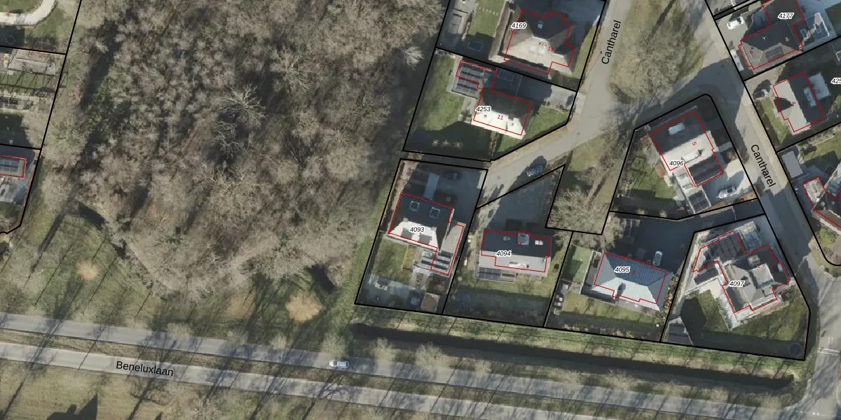 Het perceel waarop Cantharel 9 staat heeft een oppervlakte van 743 m². Dit is een groot perceel. De perceeloppervlakte wordt geregistreerd door het Kadaster. Gedetailleerde informatie over de maten van dit perceel kunt u vinden in het rapport Kadastrale kaart met maatvoering van Cantharel 9.
