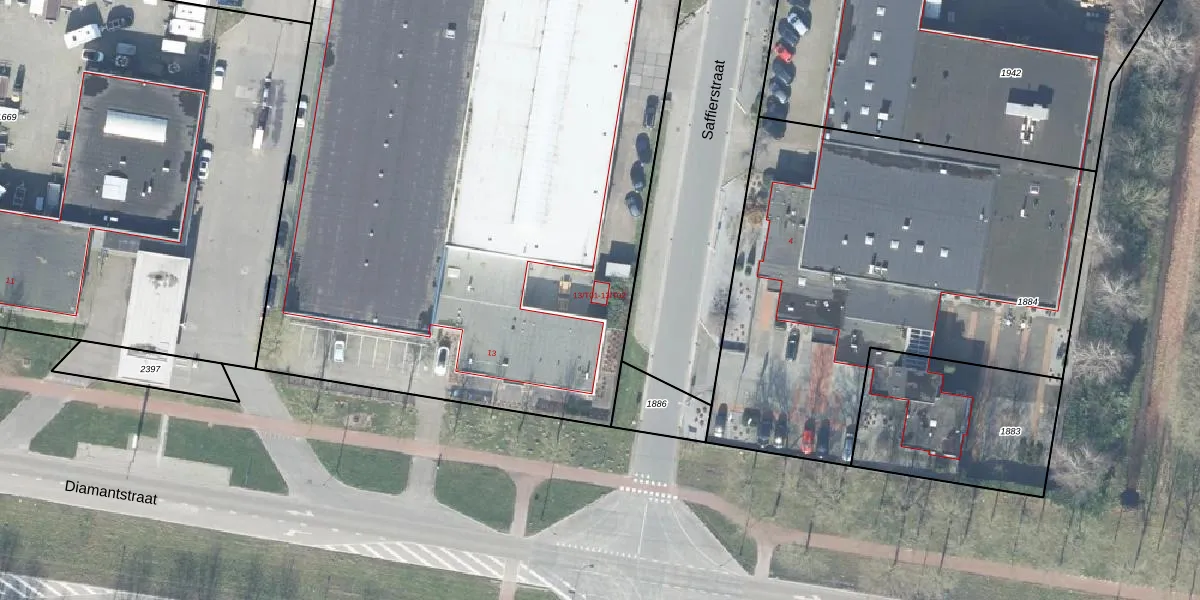 Het perceel waarop Diamantstraat 13-T01 staat heeft een oppervlakte van 1,5 ha. Dit is een zeer groot perceel. De perceeloppervlakte wordt geregistreerd door het Kadaster. Gedetailleerde informatie over de maten van dit perceel kunt u vinden in het rapport Kadastrale kaart met maatvoering van Diamantstraat 13-T01.