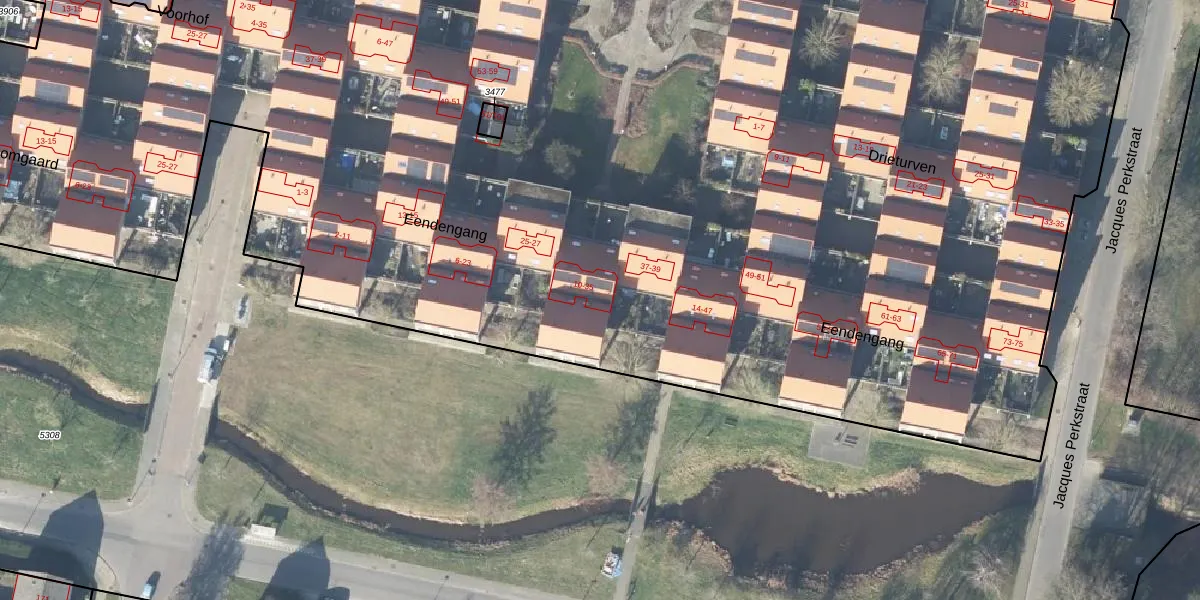 Het perceel waarop Eendengang 12 staat heeft een oppervlakte van 1,8 ha. Dit is een zeer groot perceel. De perceeloppervlakte wordt geregistreerd door het Kadaster. Gedetailleerde informatie over de maten van dit perceel kunt u vinden in het rapport Kadastrale kaart met maatvoering van Eendengang 12.