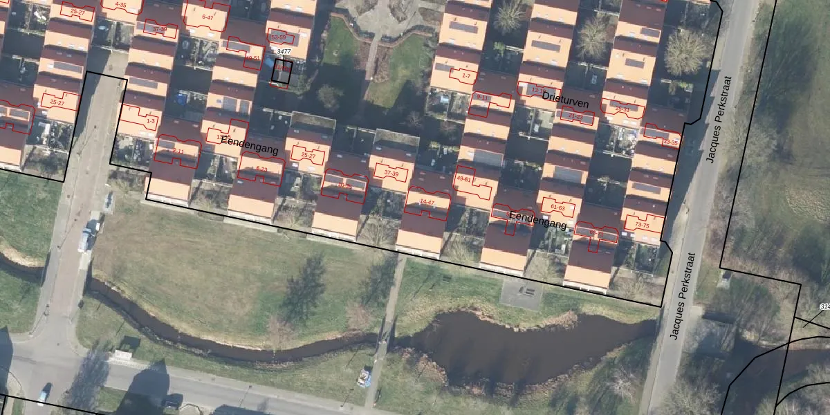 Het perceel waarop Eendengang 14 staat heeft een oppervlakte van 1,8 ha. Dit is een zeer groot perceel. De perceeloppervlakte wordt geregistreerd door het Kadaster. Gedetailleerde informatie over de maten van dit perceel kunt u vinden in het rapport Kadastrale kaart met maatvoering van Eendengang 14.
