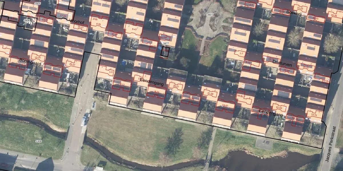Het perceel waarop Eendengang 25 staat heeft een oppervlakte van 1,8 ha. Dit is een zeer groot perceel. De perceeloppervlakte wordt geregistreerd door het Kadaster. Gedetailleerde informatie over de maten van dit perceel kunt u vinden in het rapport Kadastrale kaart met maatvoering van Eendengang 25.