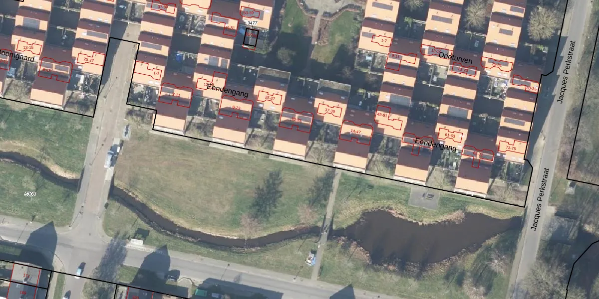 Het perceel waarop Eendengang 33 staat heeft een oppervlakte van 1,8 ha. Dit is een zeer groot perceel. De perceeloppervlakte wordt geregistreerd door het Kadaster. Gedetailleerde informatie over de maten van dit perceel kunt u vinden in het rapport Kadastrale kaart met maatvoering van Eendengang 33.