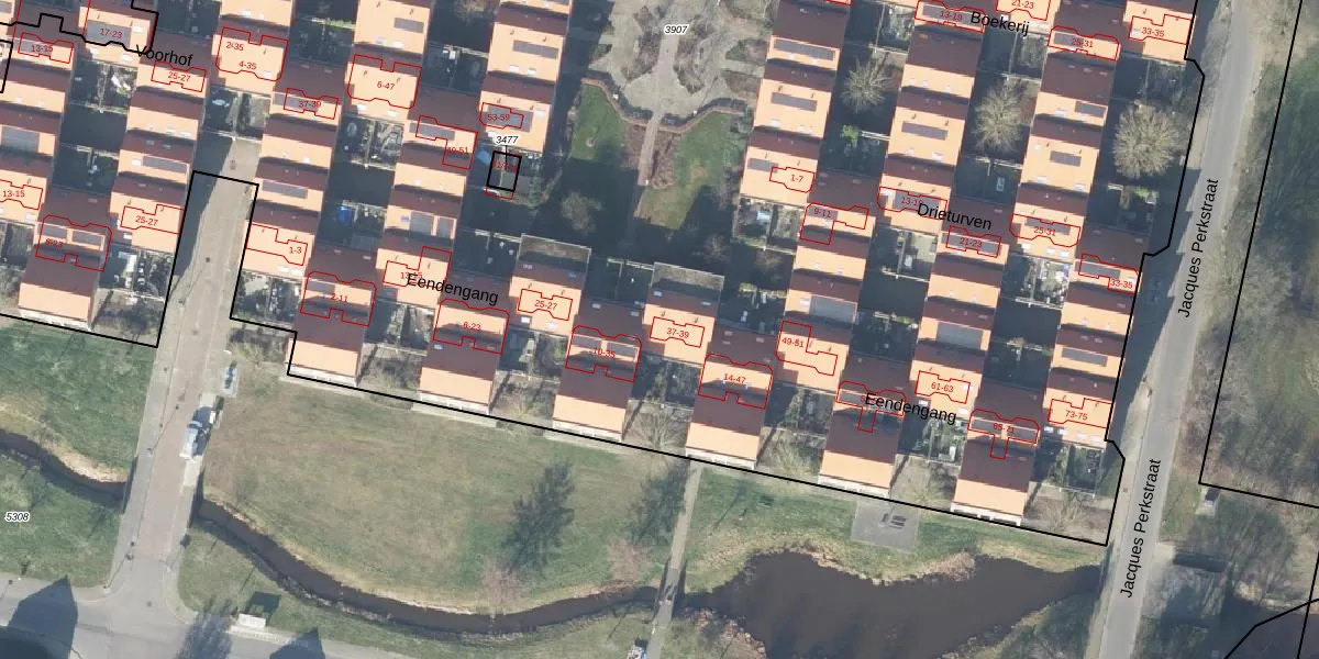 Het perceel waarop Eendengang 37 staat heeft een oppervlakte van 1,8 ha. Dit is een zeer groot perceel. De perceeloppervlakte wordt geregistreerd door het Kadaster. Gedetailleerde informatie over de maten van dit perceel kunt u vinden in het rapport Kadastrale kaart met maatvoering van Eendengang 37.