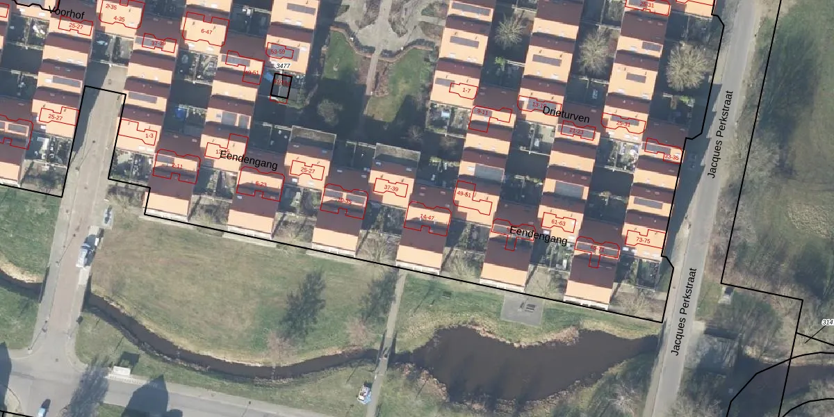 Het perceel waarop Eendengang 41 staat heeft een oppervlakte van 1,8 ha. Dit is een zeer groot perceel. De perceeloppervlakte wordt geregistreerd door het Kadaster. Gedetailleerde informatie over de maten van dit perceel kunt u vinden in het rapport Kadastrale kaart met maatvoering van Eendengang 41.
