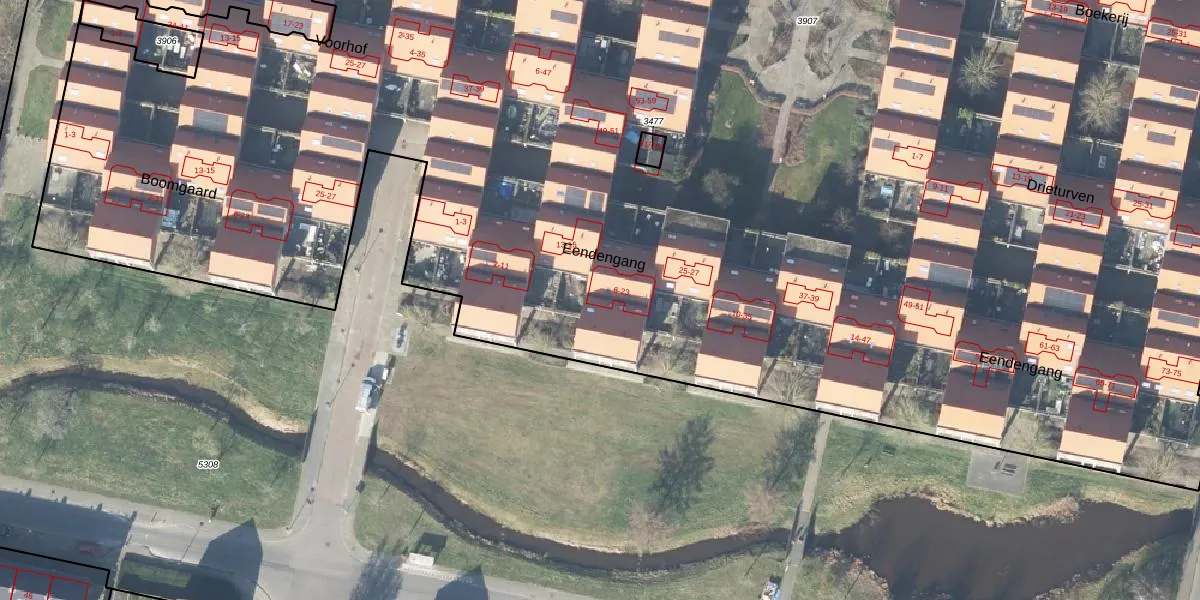 Het perceel waarop Eendengang 6 staat heeft een oppervlakte van 1,8 ha. Dit is een zeer groot perceel. De perceeloppervlakte wordt geregistreerd door het Kadaster. Gedetailleerde informatie over de maten van dit perceel kunt u vinden in het rapport Kadastrale kaart met maatvoering van Eendengang 6.