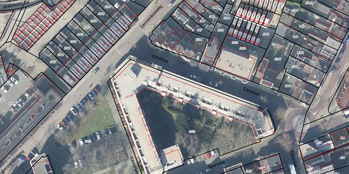 Het perceel waarop Eikstraat 12 staat heeft een oppervlakte van 3669 m². Dit is een zeer groot perceel. De perceeloppervlakte wordt geregistreerd door het Kadaster. Gedetailleerde informatie over de maten van dit perceel kunt u vinden in het rapport Kadastrale kaart met maatvoering van Eikstraat 12.