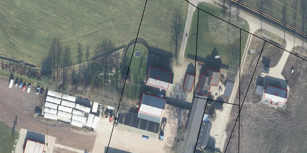 Het perceel waarop Scharfdijk 2 staat heeft een oppervlakte van 6495 m². Dit is een zeer groot perceel. De perceeloppervlakte wordt geregistreerd door het Kadaster. Gedetailleerde informatie over de maten van dit perceel kunt u vinden in het rapport Kadastrale kaart met maatvoering van Scharfdijk 2.
