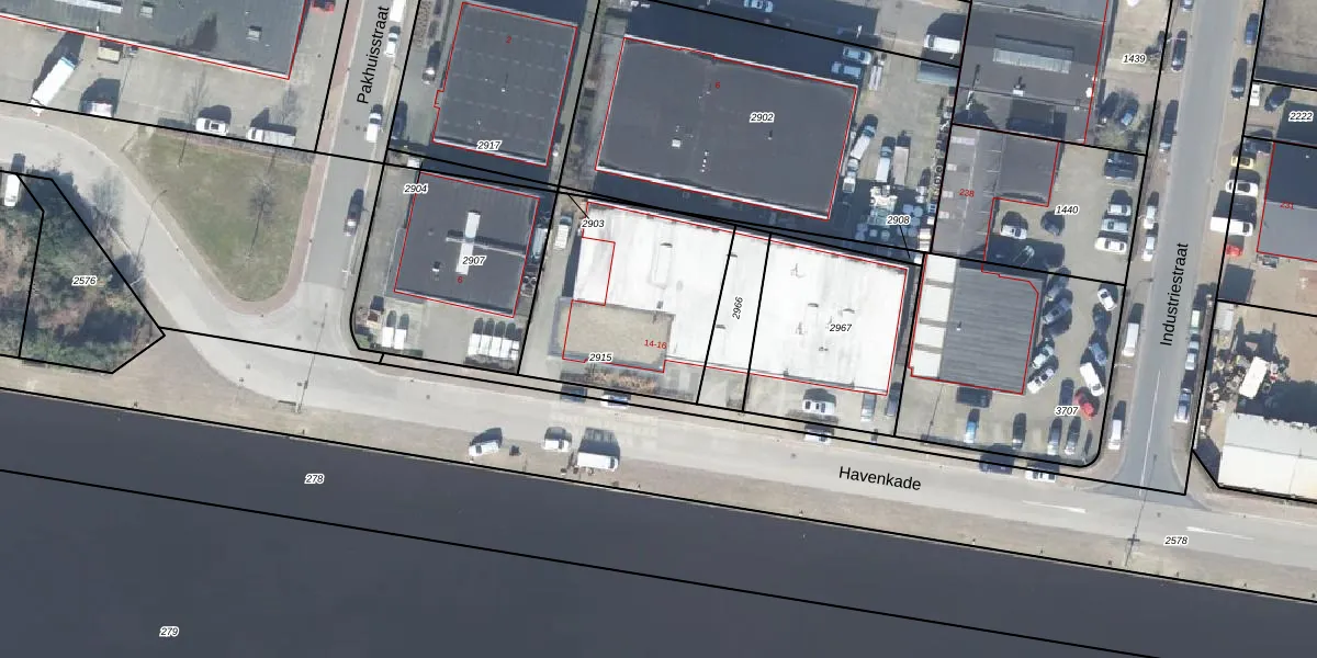 Het perceel waarop Havenkade 14 staat heeft een oppervlakte van 780 m². Dit is een groot perceel. De perceeloppervlakte wordt geregistreerd door het Kadaster. Gedetailleerde informatie over de maten van dit perceel kunt u vinden in het rapport Kadastrale kaart met maatvoering van Havenkade 14.