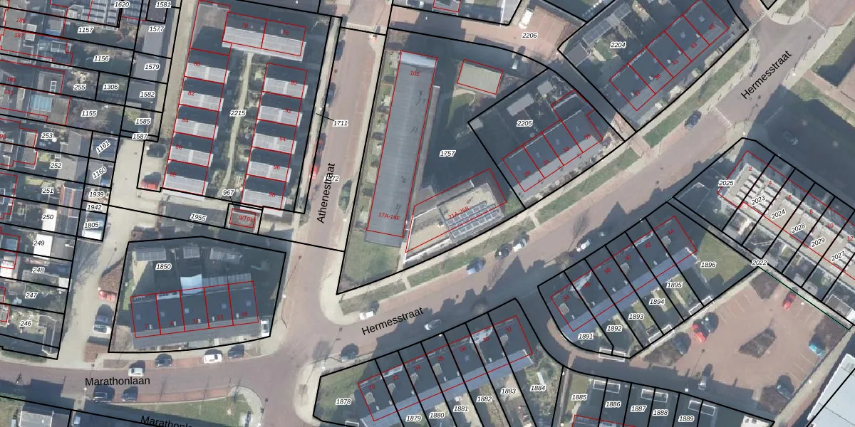 Het perceel waarop Hermesstraat 23-A staat heeft een oppervlakte van 1714 m². Dit is een zeer groot perceel. De perceeloppervlakte wordt geregistreerd door het Kadaster. Gedetailleerde informatie over de maten van dit perceel kunt u vinden in het rapport Kadastrale kaart met maatvoering van Hermesstraat 23-A.