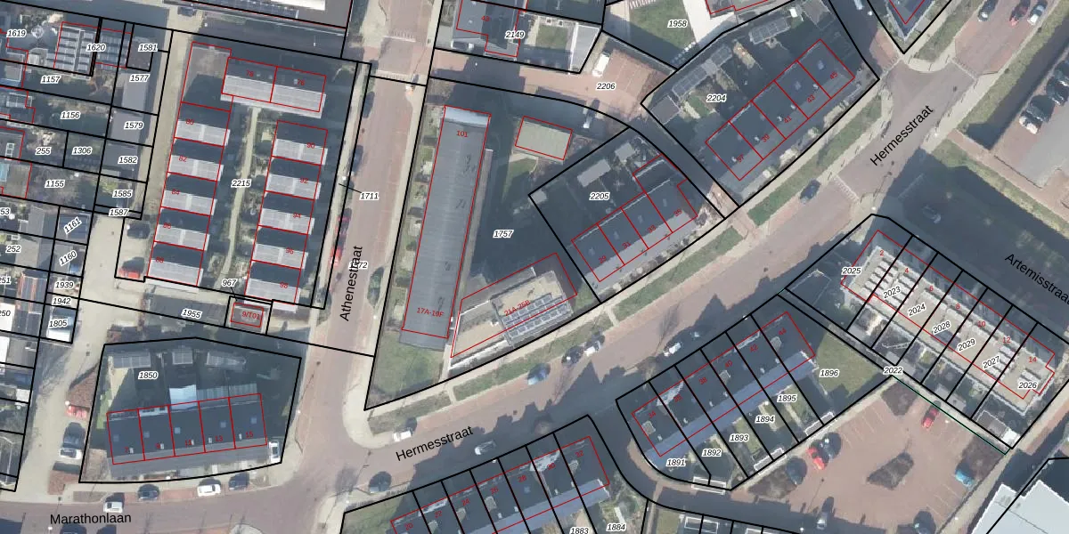 Het perceel waarop Hermesstraat 25-B staat heeft een oppervlakte van 1714 m². Dit is een zeer groot perceel. De perceeloppervlakte wordt geregistreerd door het Kadaster. Gedetailleerde informatie over de maten van dit perceel kunt u vinden in het rapport Kadastrale kaart met maatvoering van Hermesstraat 25-B.