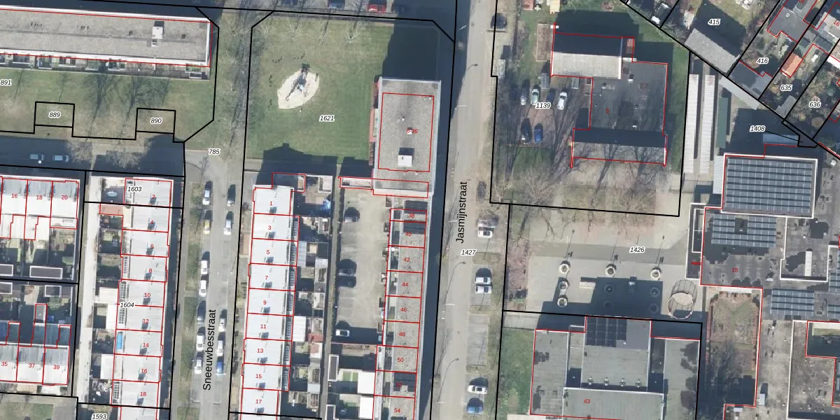 Het perceel waarop Jasmijnstraat 38 staat heeft een oppervlakte van 4855 m². Dit is een zeer groot perceel. De perceeloppervlakte wordt geregistreerd door het Kadaster. Gedetailleerde informatie over de maten van dit perceel kunt u vinden in het rapport Kadastrale kaart met maatvoering van Jasmijnstraat 38.