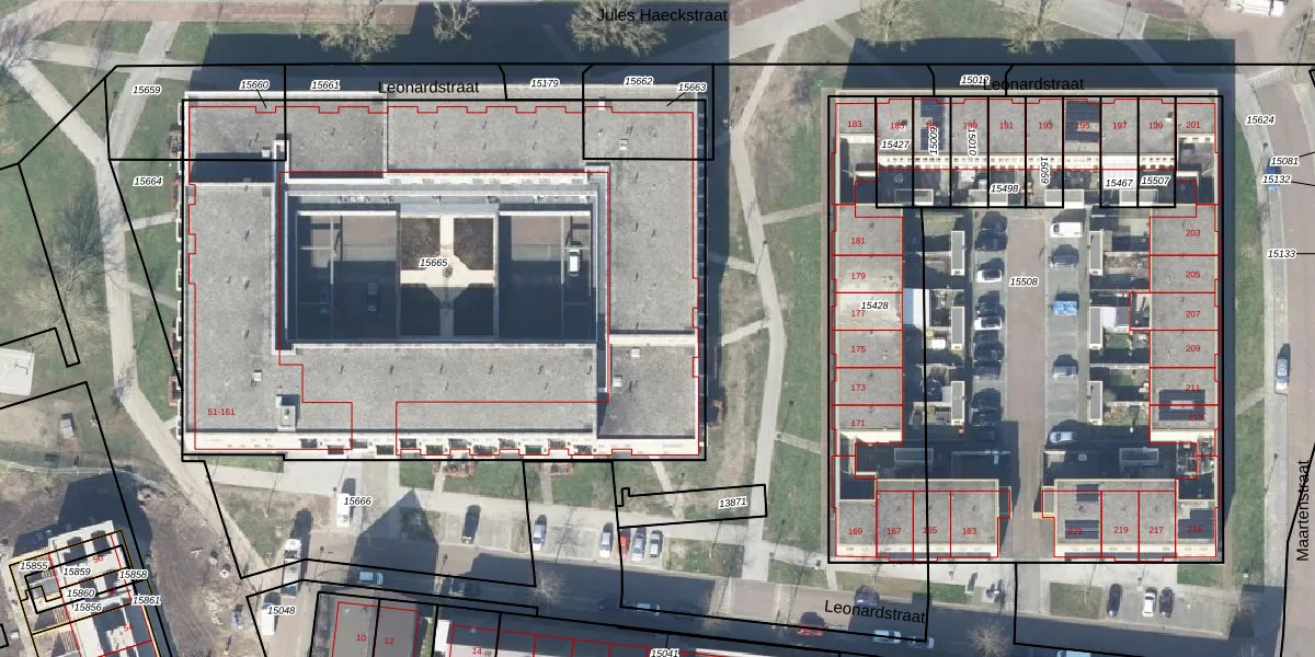 Het perceel waarop Leonardstraat 105 staat heeft een oppervlakte van 4035 m². Dit is een zeer groot perceel. De perceeloppervlakte wordt geregistreerd door het Kadaster. Gedetailleerde informatie over de maten van dit perceel kunt u vinden in het rapport Kadastrale kaart met maatvoering van Leonardstraat 105.