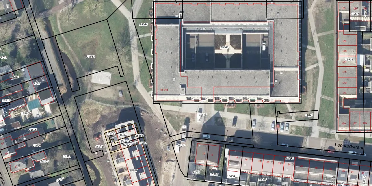 Het perceel waarop Leonardstraat 121 staat heeft een oppervlakte van 4035 m². Dit is een zeer groot perceel. De perceeloppervlakte wordt geregistreerd door het Kadaster. Gedetailleerde informatie over de maten van dit perceel kunt u vinden in het rapport Kadastrale kaart met maatvoering van Leonardstraat 121.