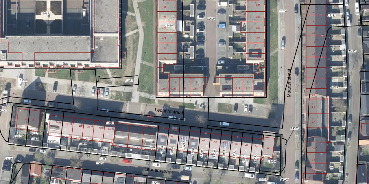 Het perceel waarop Leonardstraat 165 staat heeft een oppervlakte van 2667 m². Dit is een zeer groot perceel. De perceeloppervlakte wordt geregistreerd door het Kadaster. Gedetailleerde informatie over de maten van dit perceel kunt u vinden in het rapport Kadastrale kaart met maatvoering van Leonardstraat 165.